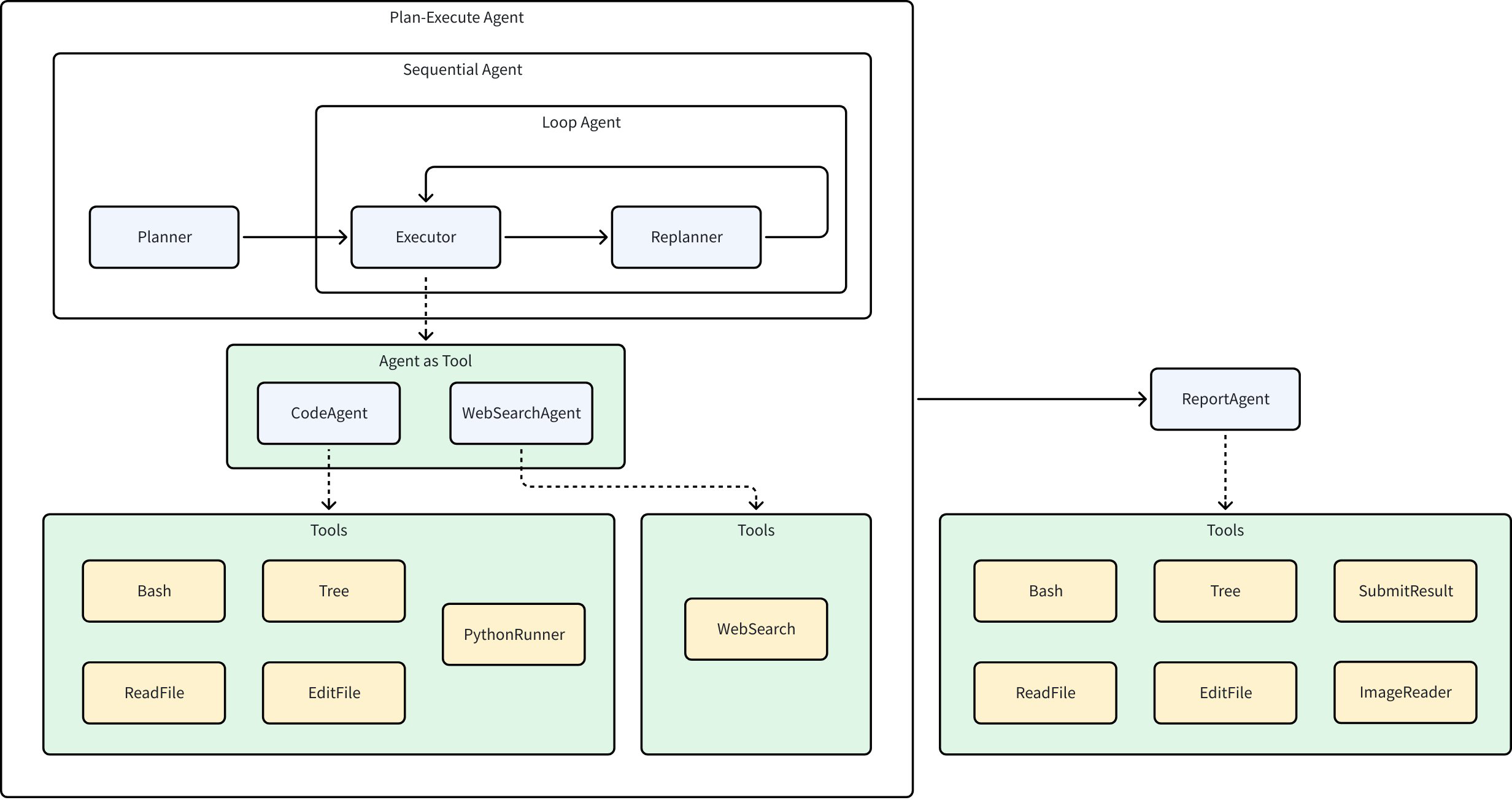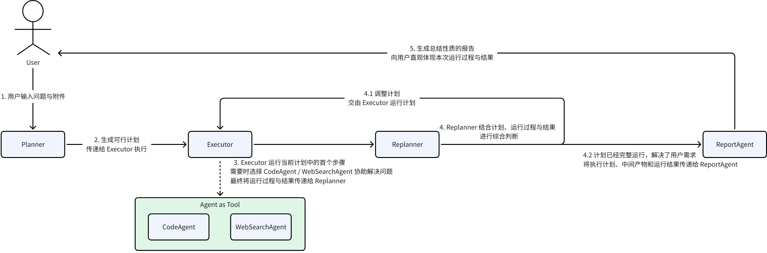 • Executor: call tools (Excel reading, system commands, Python) to perform steps